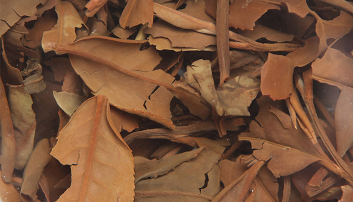 叶片基本为棕红色、质地偏硬的老叶片,大小颜色都比较匀整,有少量芽头,茶梗稍多。