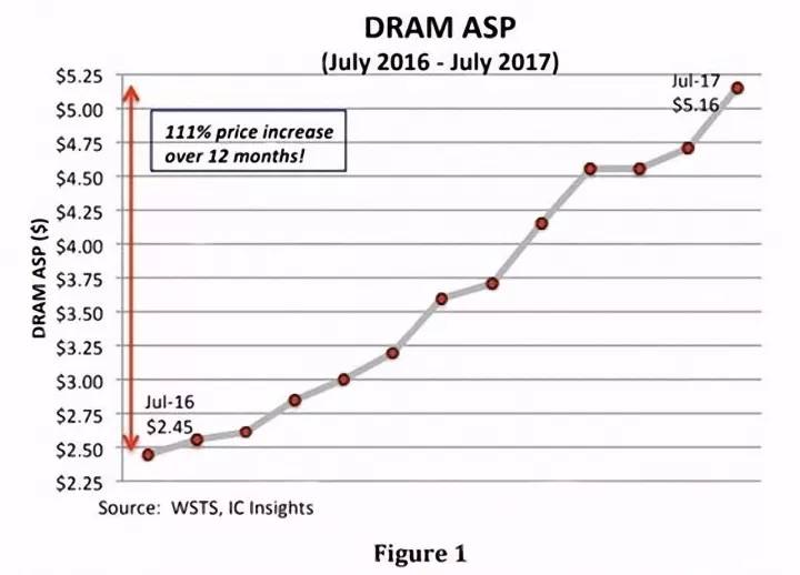 据 IC Insights 报告显示,过去的 12 个月,DRAM 已经从 2.45 美元涨到 5.16 美元,涨幅达到惊人的 111%,而且,在年底之前,DRAM 预期还会出现高达 40% 的增长。