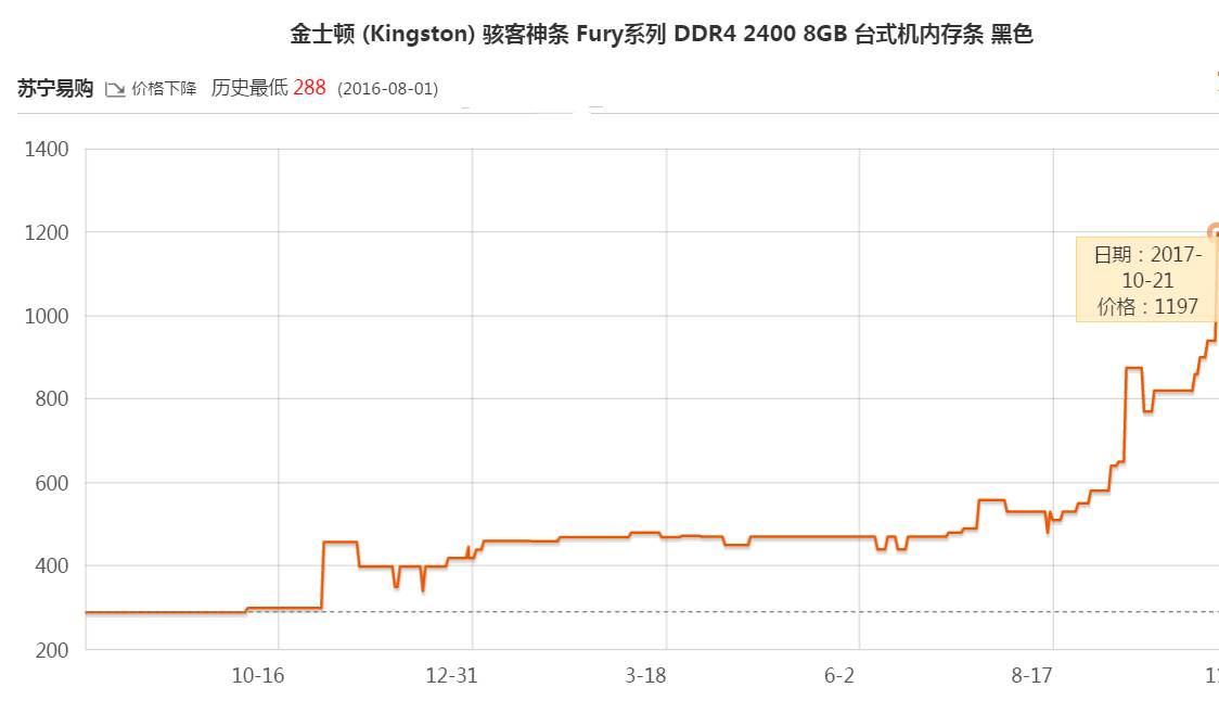 以当下主流的金士顿骇客神条 Fury 系列为例,单条 8GB DDR4-2400 如今在苏宁上的报价已经高达 1197 元,是一年多前 288 元历史最低价的 4 倍之多。