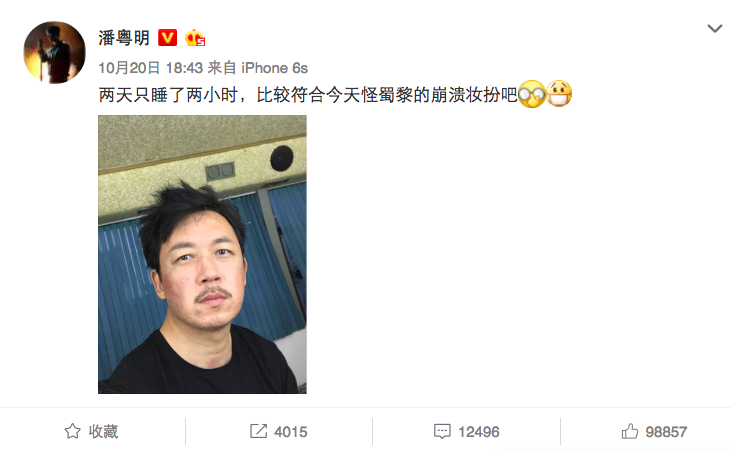 “潮是什么意思?”潘粤明裹着他那件黑色羽绒背心问身边的人。经纪人逗他,潮就是湿的意思。在搞明白潮意指何物后,潘粤明眼睛瞬间发亮,“我可不落伍,我从小就听摇滚,有好多件皮衣呢。”