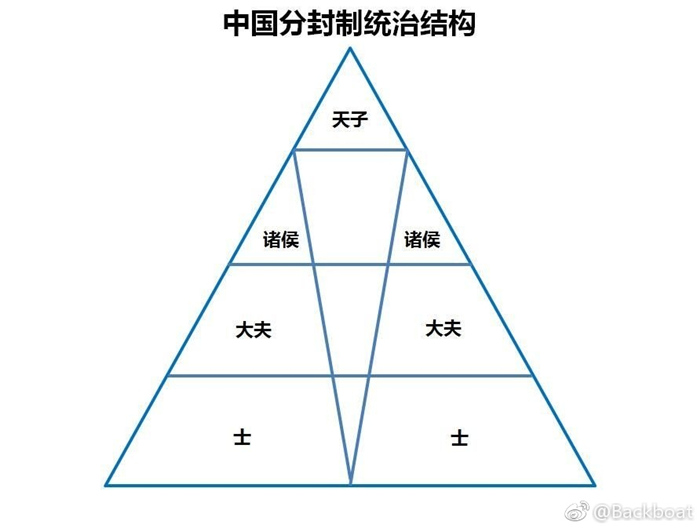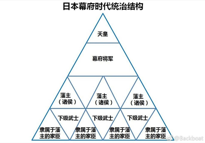 但从统治结构和形式上看,实际上是类似于中国西周时期分封诸侯的统治模式。日本各个地区的藩主相当于中国春秋战国时期的诸侯,幕府实际上是通过军队和武力保持对各地藩主的震慑力,由藩主对本地进行间接统治,形成一个网格状的金字塔结构(如下图):