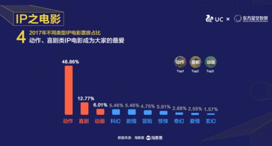 “动作类IP”才是电影观众的最爱,票房占比达到48.86%。现在几乎可以断定,2017年的票房冠军无疑是《战狼2》,这部现象级电影最终以56.83亿的成绩收官。而票房紧随其后的也是一部动作类IP电影,《速度与激情8》,以26.67亿票房位列外语片第一位。