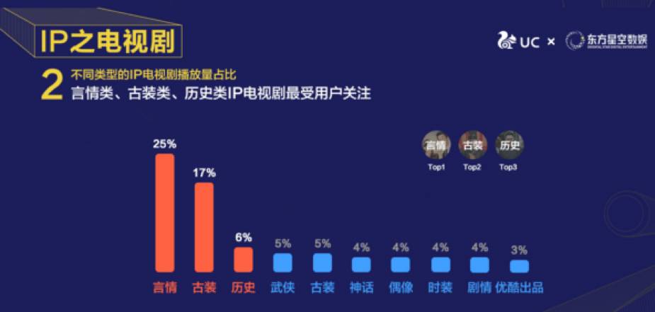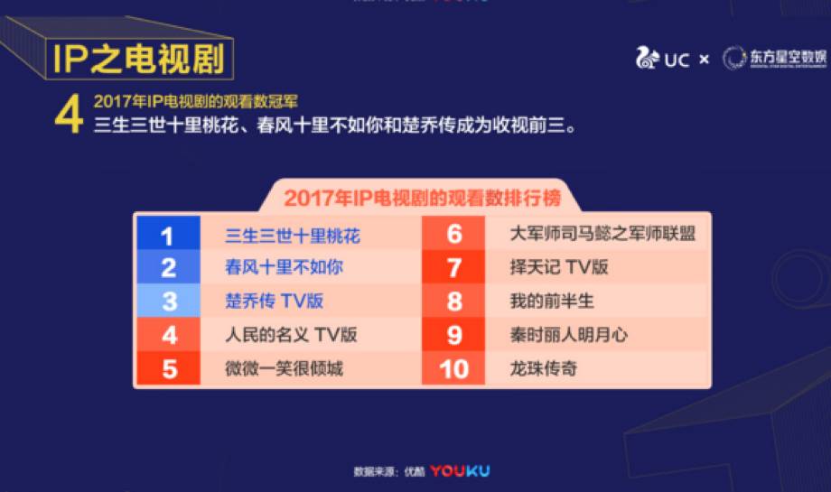 而优酷相关数据显示,在今年优酷平台播放量前100的电视剧中,IP类电视剧有60部,占比60%。而且有很多都是知名大IP,比如《三生三世十里桃花》、《春风十里不如你》和《楚乔传》。有热门IP加持的言情、古装剧更容易获得流量。
