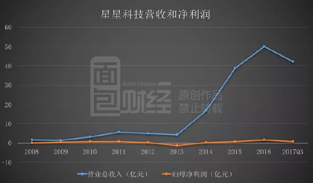 2015年,星星科技以14亿元并购深圳联懋,营收又上了一个台阶:2015年营收为38.85亿元,同比增长1.3倍,净利润为6508万元,同比增长1.4倍。净利润终于回归到上市首年的水平以上。