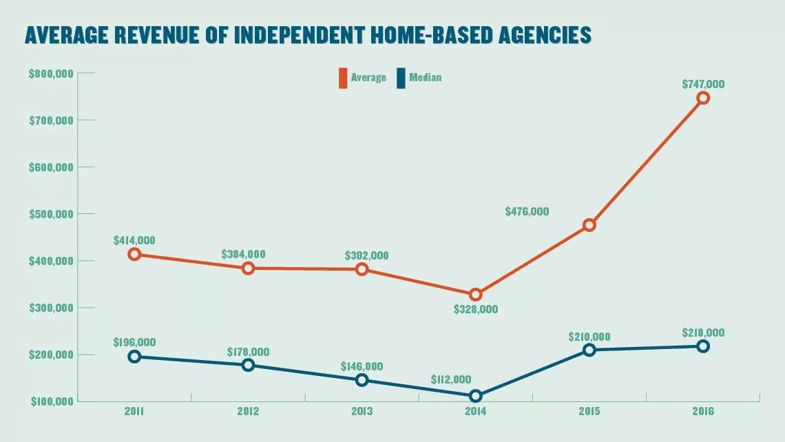 上图是在家工作的私营代理商平均年收益和收益中间值随时间走势图。其中红色是平均值,蓝色是中间值。很明显,两者之间的差距越来越大。2016年在家工作的私营代理商平均年收入达到74.7万美元,而中间值仅有21.8万美元。从两者的走势其实也可以猜测出,大型的在家工作的私营代理商与小型代理商之间的收入差距正在不断扩大。