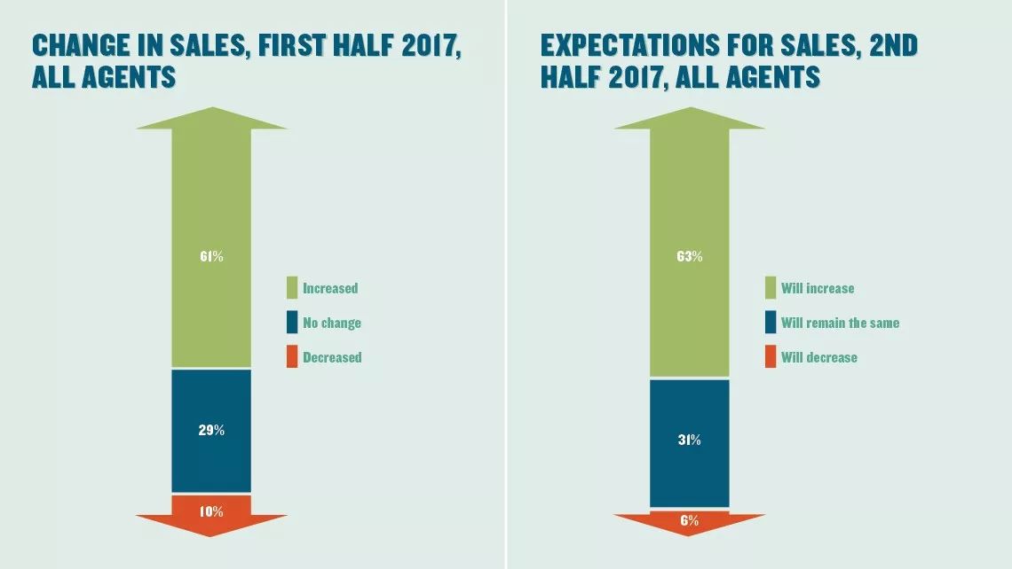 上图是所有旅游代理商2017年销售情况图。左边是2017年上半年的销售情况,绿色表示销售额上升的代理商61%,蓝色代表销售额没有变化的代理商29%,而红色是销售额下降的代理商10%。右边是2017年下半年销售情况预测,其中销售额预测下降的代理商减少至6%。