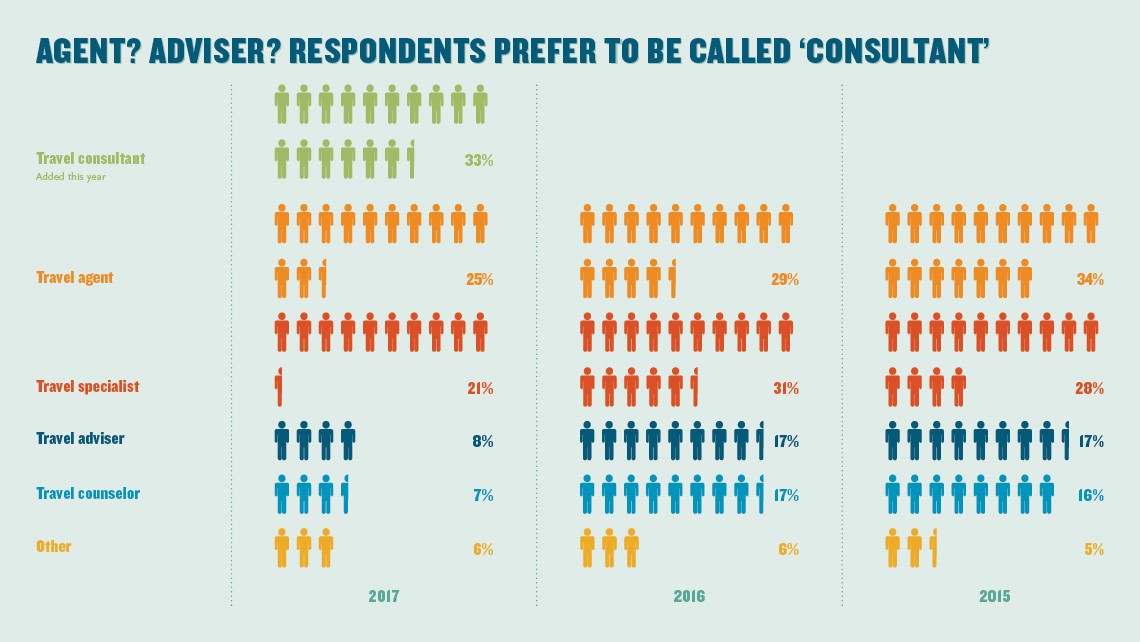这个是旅游行业从业者的比例图。可以看到,2017年新增加了一个分类,旅游咨询者(一些旅游代理商和旅游指导更喜欢称自己为旅游咨询者)。同时,2017年旅游咨询者所占比例也是最高的,达到33%。而以下五种分类则分别列举了2015-2017三年间的数据,它包括旅游代理商、旅游专家、旅游指导、旅游顾问和其他。