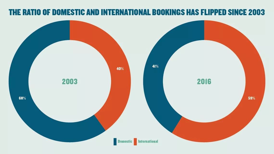 上面分别2003年和2016年美国旅游产品预定量和国际旅游产品预定量的对比图。可以看到,2003年国际旅游产品预定量仅占40%,而到2016年,该比例已经上升至59%。这直接反映出美国游客正在越来越多的参与到国际游当中。