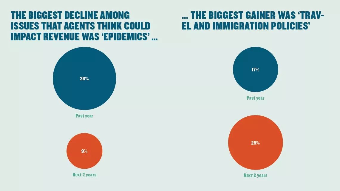 如图所示,参与调查的代理商之中,28%的受访者认为去年流行病对旅游发展产生了负面影响,而仅有9%的受访者认为流行病在未来两年将继续对旅游产生负面影响。17%的受访者表示去年旅游和移民政策对旅游业产生负面影响,而谈到未来两年时,这一比例将上升至25%。我们由此可以推测:特朗普接二连三的旅游禁令激发了美国旅游代理商的担忧情绪。