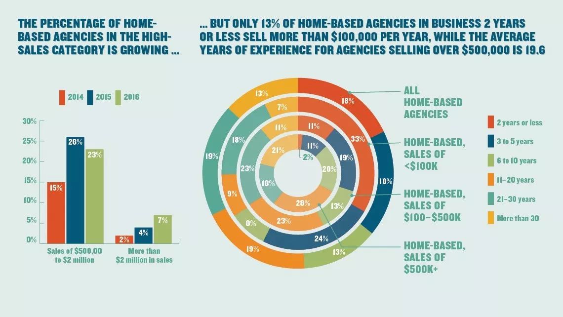 左边的柱形图是不同年销售额的在家工作的代理商(包括在家工作的私营代理商和在家工作的雇员代理商)占所有受访者的比例,一共分为两个阶段:年销售额在5万-200万美元之间和200万美元以上。可以看到,高销售额代理商占比有明显提高,2014年仅占2%,2016年则涨至7%。