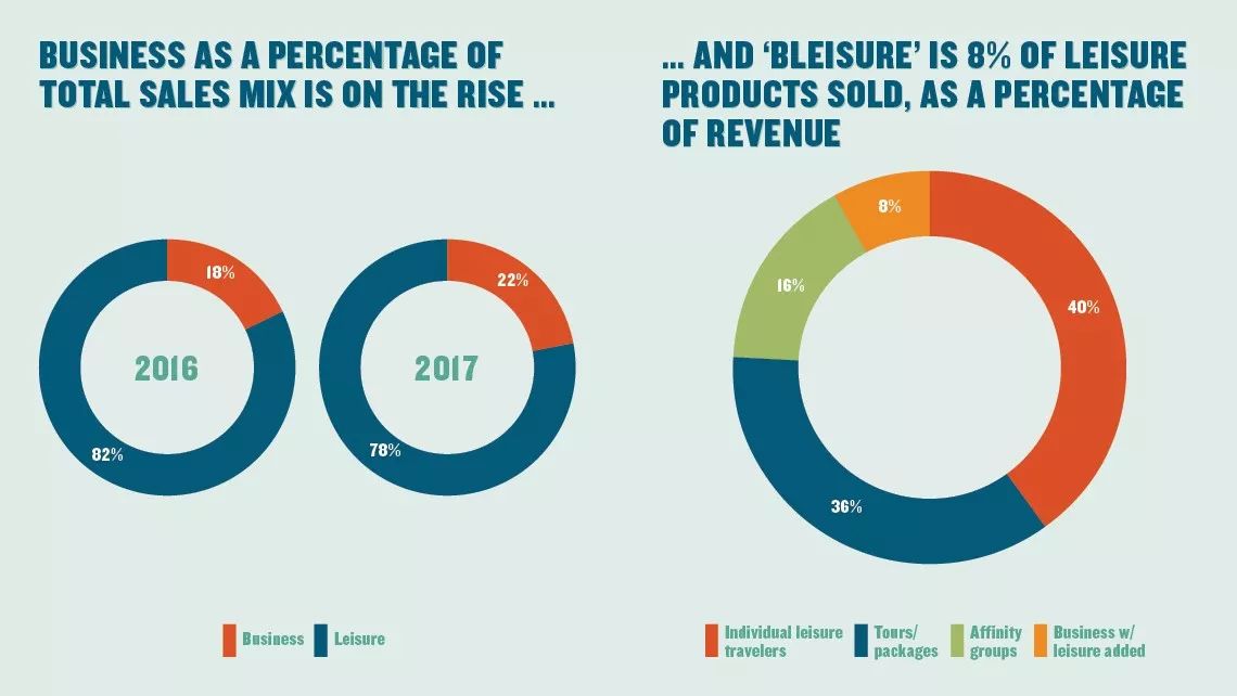 上图是旅游产品销售图和产品收益图:其中左图2016年商务旅行产品销售数量仅占18%,但2017年上涨至22%。而右图的旅游产品收益中,我们可以看到占比最大的个人休闲游产品收入40%,其次是旅游套餐收入36%,团体游产品收入是16%,商务休闲结合游产品收入则是8%。