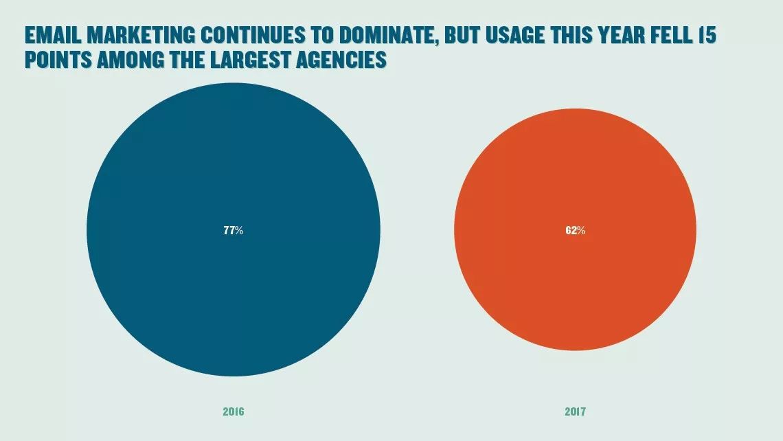 上图是2016年和2017年的大型旅游代理商的邮件营销占比。可以看到,2016年77%的代理商选择邮件营销,而2017年则下降了15个百分点至62%。关于邮件营销占比下降的原因,我们在后面的报告内容中会有详细解。