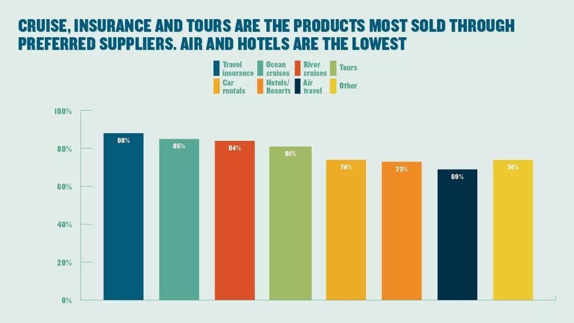 上图是不同旅游产品通过首选供应商预订的比例图,从左到右分别是旅游保险88%、海洋邮轮85%、内河游轮84%、观光游玩81%、租车74%、酒店、度假村73%、航空69%、其他74%。