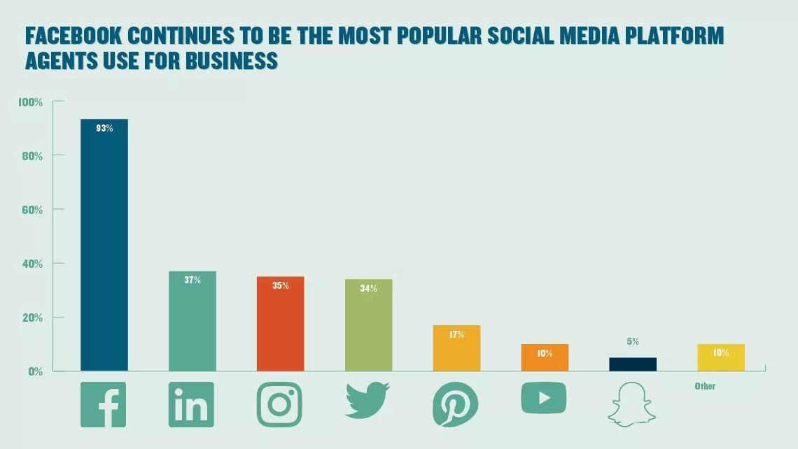 这张是代理商对不同营销方式的使用比例图,从左到右依次是:邮件、社交媒体、网站、新闻资讯、慈善或社区活动、旅游过夜或咖啡、传单、网络广告、移动端、报纸广告、电视营销、视频广告。