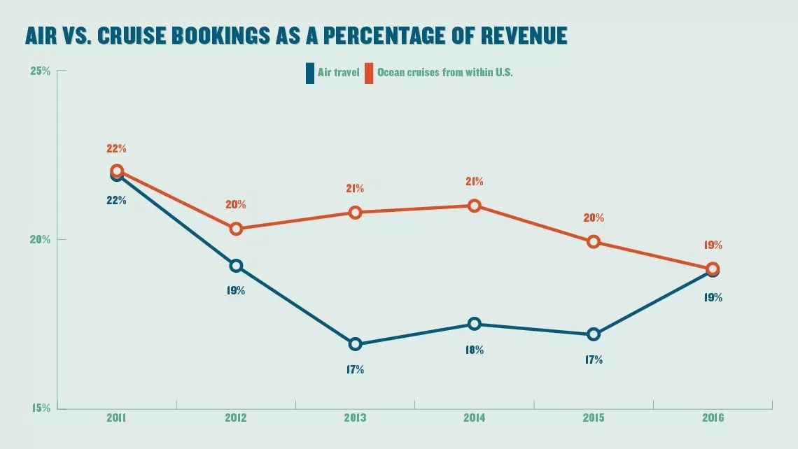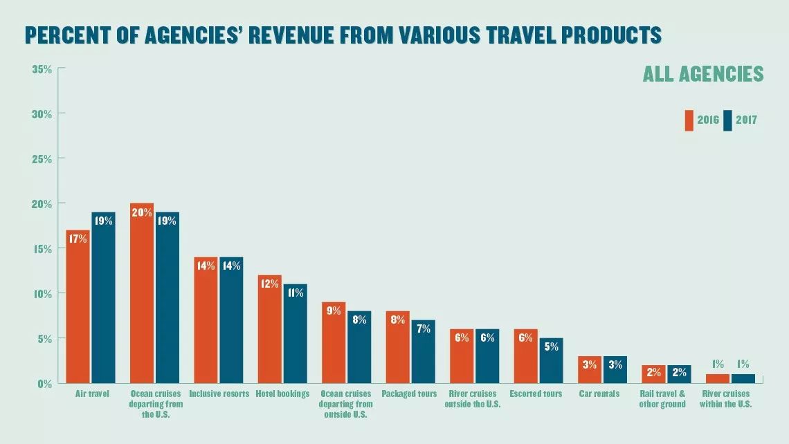 上图是2016年和2017年所有旅游代理商不同旅游产品的收入比例。从左向右分别是航空、从美国出发的远洋邮轮、套餐式度假村、酒店预订、从美国以外国家出发的远洋邮轮、打包旅游产品、美国以外的内河游轮、接待旅游团、租车、火车及其他陆上交通、美国部内河游轮。从中我们可以看到,近两年旅游产品收益比例整体变化不大,航空和远洋邮轮业务在代理商收入比例中占比最高。