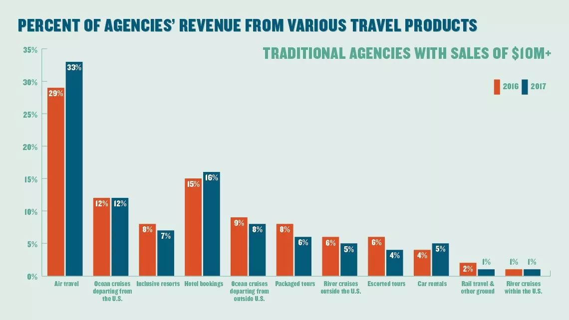 上图是年销售额超过1000万美元的传统代理商各旅游产品收入占比。其中,机票收入一枝独秀,在2016年和2017年分别占到总收入的29%和33%。