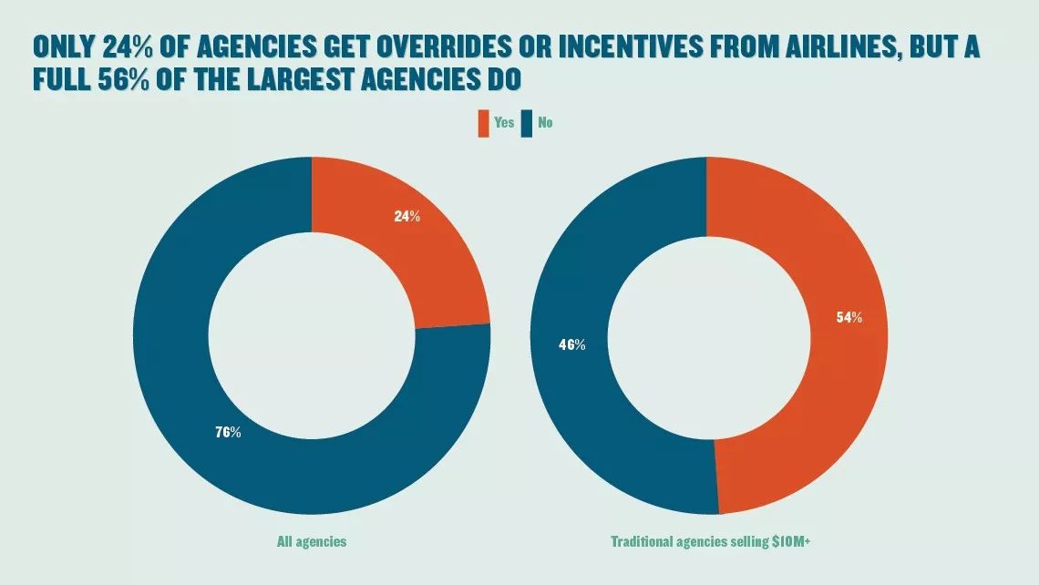 上图显示的是代理商受航空驱动影响的比例图。左图表示的是所有受访代理商受航空驱动占比,表示肯定的仅有24%。右图是年销售额超过1000万美元的传统代理商受航空驱动占比,表示肯定的代理商数量占到了54%。从侧面可以看出,规模越大的旅游代理商对航空的依赖程度越高。