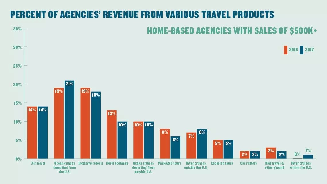 根据以上数据,大型传统代理商(年收入1000万美元以上)和大型在家工作的代理商(年收入50万美元以上)之间的旅游产品收入占比有明显差异。从美国出发的远洋邮轮收入在在家工作的代理商收入占比中遥遥领先,而机票收入在传统代理商收入占比中独占鳌头,大型在家工作的代理商的度假村收入占比要高于传统的大型代理商,但传统大型代理商的酒店收入占比要比在家工作的代理商大得多。