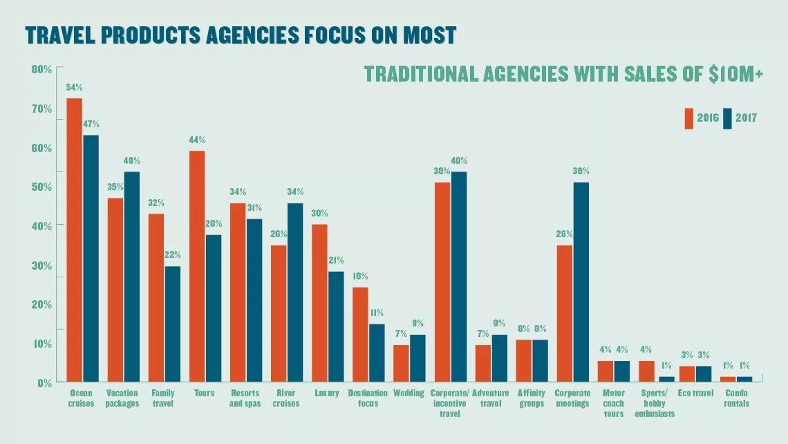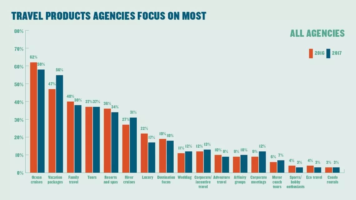 而豪华游则出现明显下滑,总体占比从22%下降至17%,对于传统大型代理商来说降幅更为明显,只有21%表示专注于此,而2016年这一比例是30%。