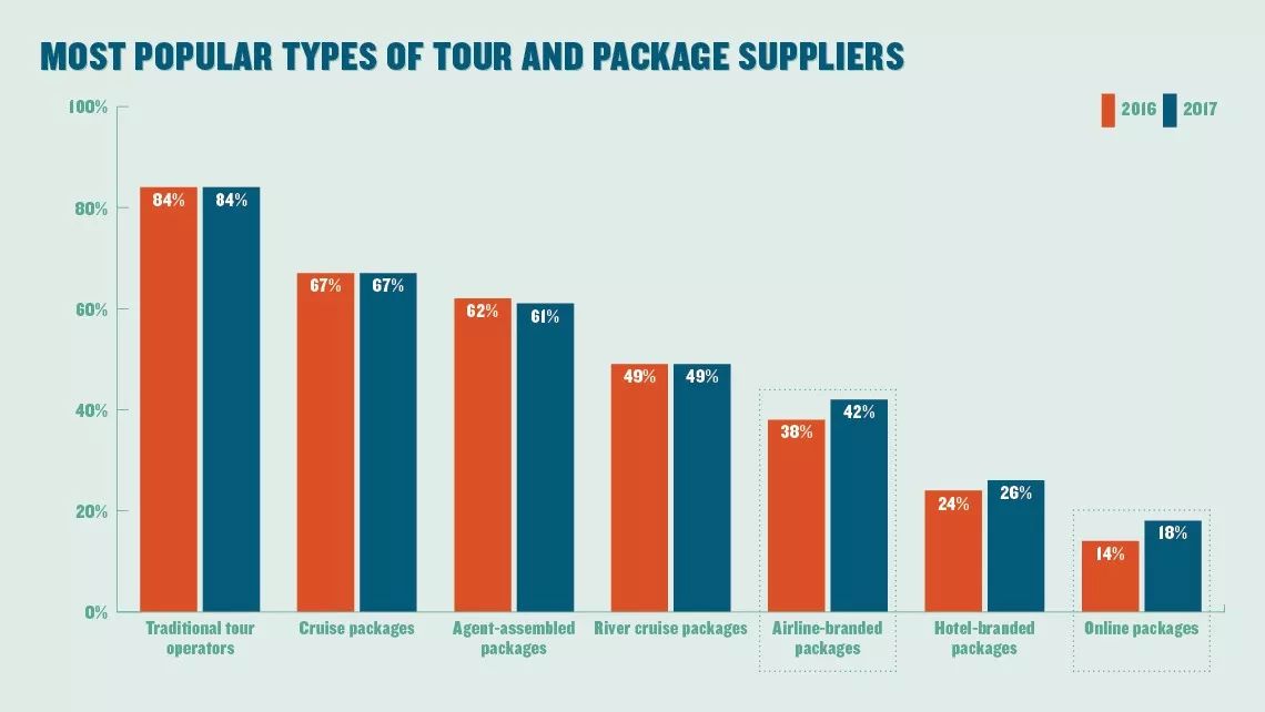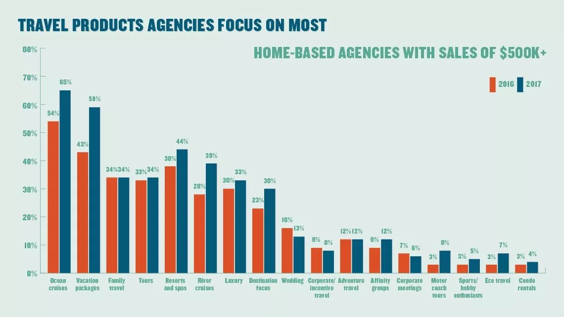总体而言,最大的赢家是度假套餐产品,从2016年的47%跃升至56%。而在家工作的代理商中,这一占比涨幅更大,从去年的43%涨至59%。