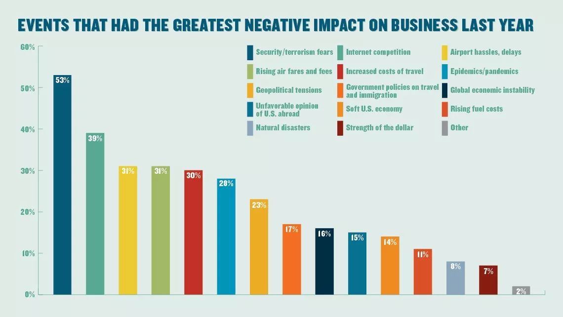 上图是2016年对代理商业务造成负面影响的各类因素占比,从左到右分别是:安全因素(恐怖主义)、网络竞争、航班延误等问题、机票价格上涨、旅行消费上涨、流行病、边缘政治、政府旅游和移民政策、全球经济不稳定、排美情绪、美国经济疲软、燃油费用上涨、自然灾害、美元坚挺度、其他。可以看出,除了安全方面的考虑之外,网络竞争是对代理商造成负面影响的最主要因素。