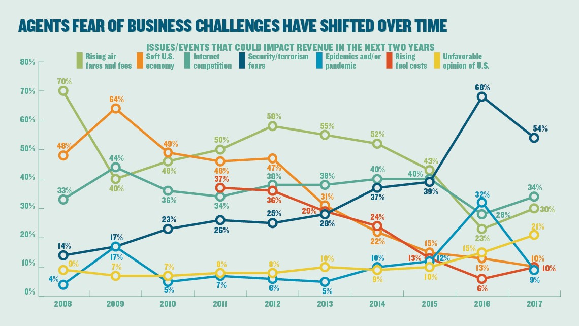 上图是旅游代理商对于不同的行业影响因素的担忧比例随时间的变化图。除了燃油费用增长这一项(红色折线)是从2011年开始的之外,其余都是从2008年一直到2017年的数据。从上到下分别是:航空费用增加(浅绿色)、美国经济疲软(橘色)、网络竞争(绿色)、地区安全及恐怖主义 (蓝色)、排美情绪(黄色)、流行病(红色)。