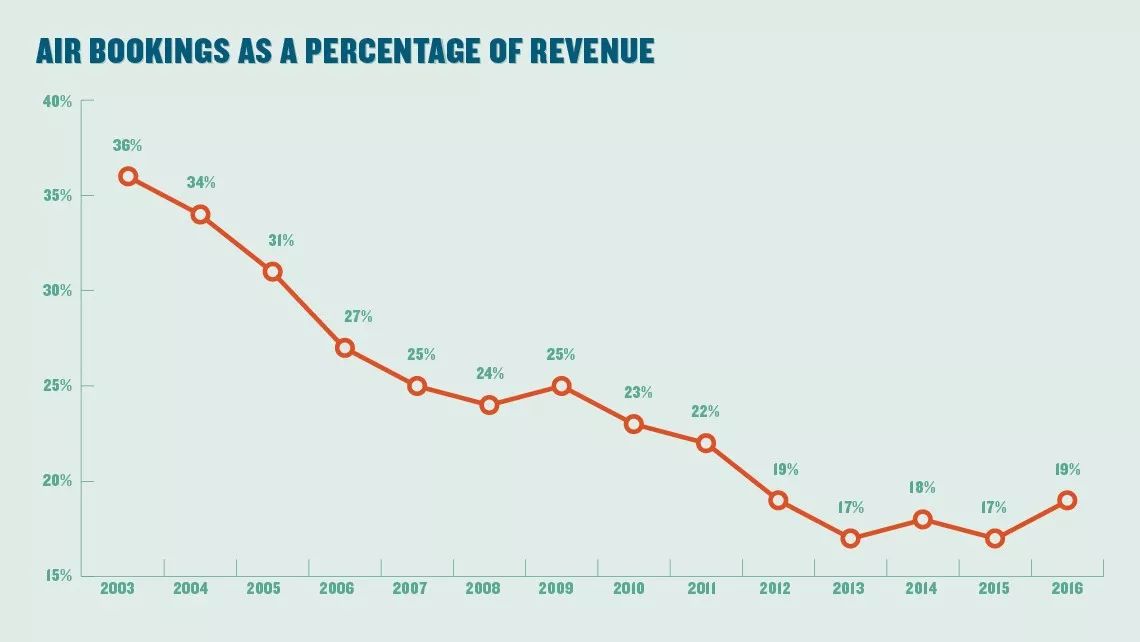 虽然从第一张走势图来看,近年来航空收入似乎有点停滞不前了,,2016年相较于2015年而言确上涨了2个百分点达19%,那造成这一变化的原因有哪些?