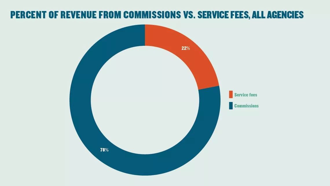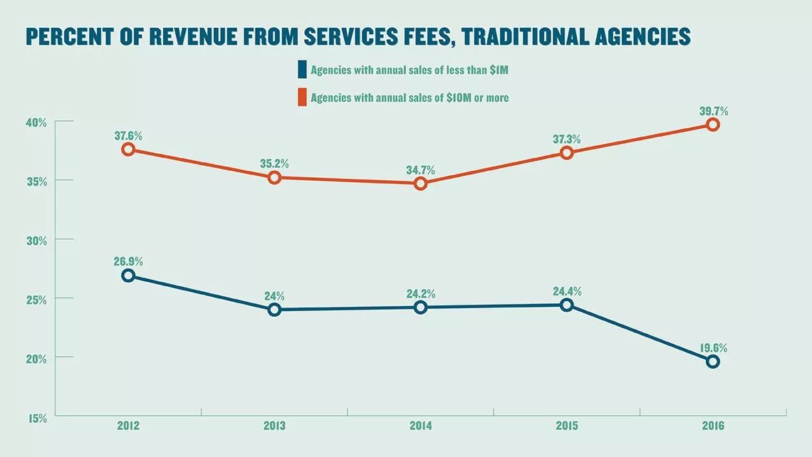 可以看出,在收取服务费方面,大型和小型代理商的收入差距正在逐渐拉大。2017年数据显示,年销售额达1000万美元或以上的代理商服务费收入占总收入的39.7%,而年销售额在100万美元以下的小型代理商服务费收入占比仅有19.6%。而2012年,该收入占比差距还远没有这么明显。