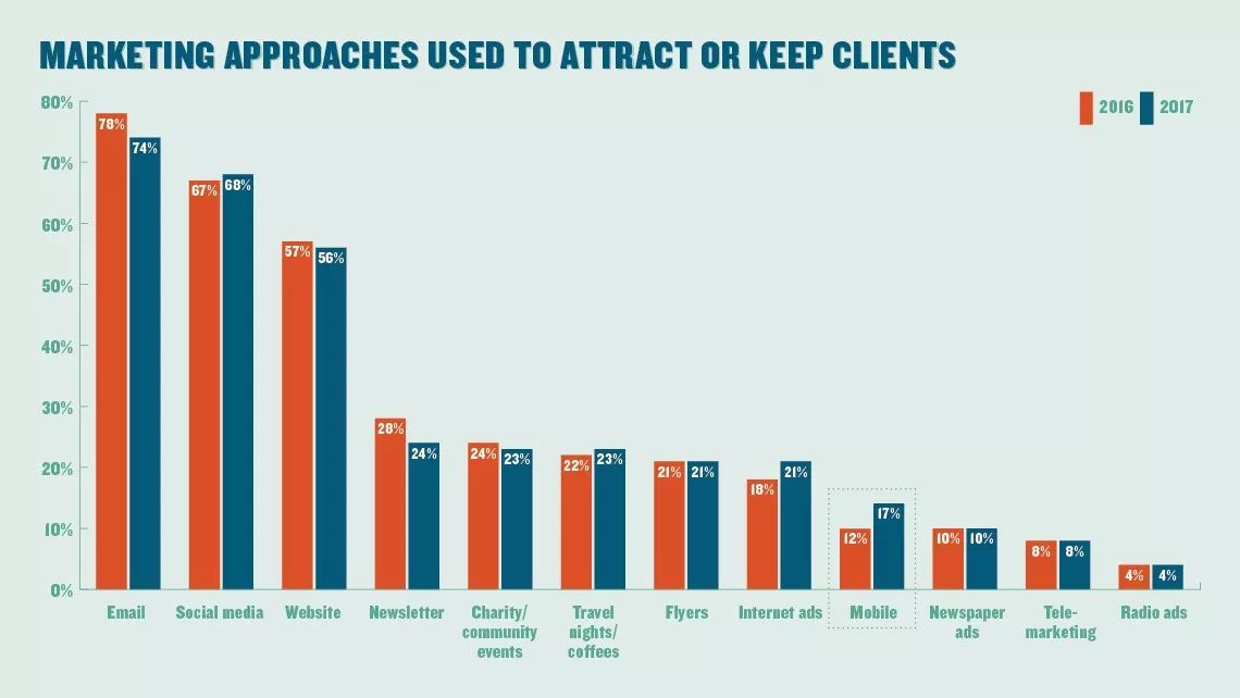 从上图可以看出,2017年有17%的受访代理商表示移动端营销是保留现有客户、发展新客户的重要手段,相比2016年的12%,同比增长远大于其他营销方式。