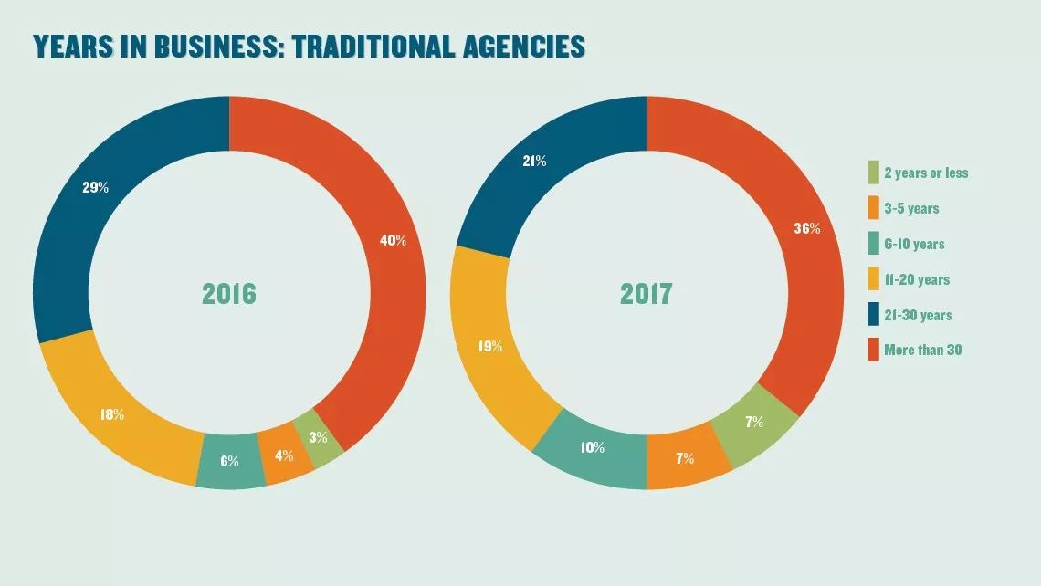 这张是从业时间不同的传统代理商数量占比图。可以看到,运营时间在2年以下的代理商2016年仅占3%,2017年这一比例上升至7%。