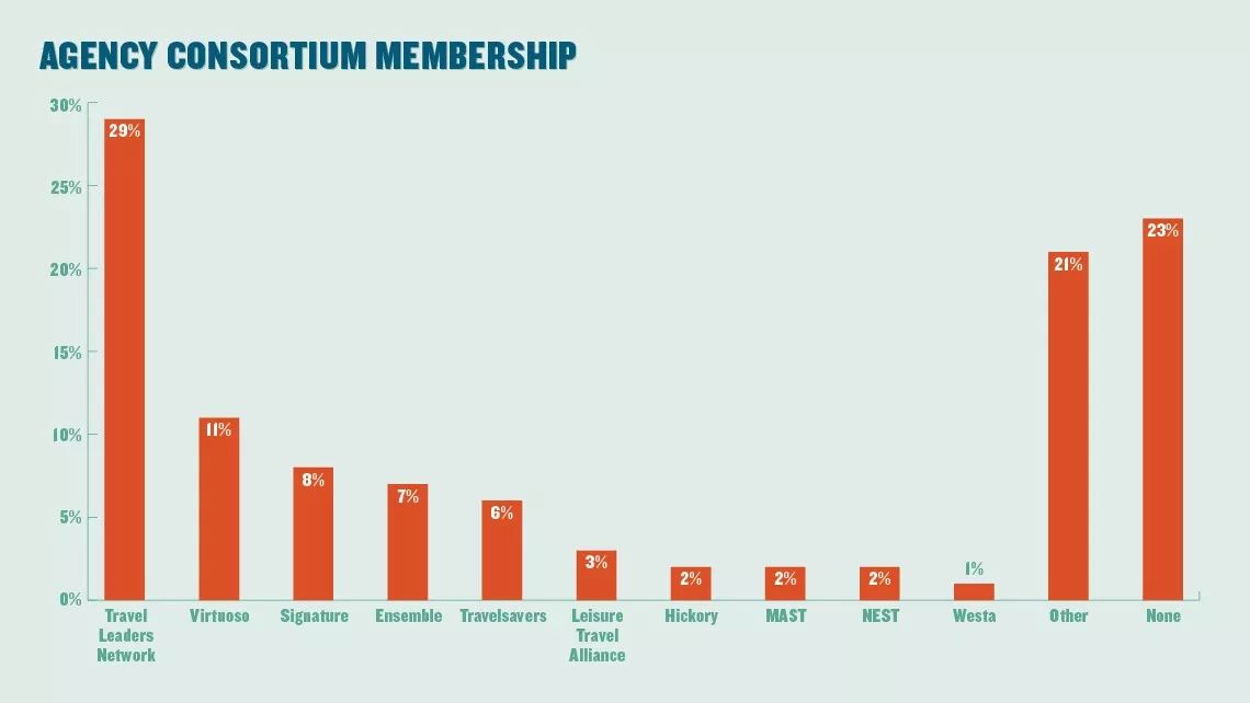 上图是代理商加入的不同联盟对比图。其中任何联盟都不加入的代理商仅占23%,也就是77%的代理商都有所属联盟团体。而在这些旅游团体中,最受欢迎的是旅游领导网络Travel Leaders Network,29%的代理商选择加入该联盟。而在美国本土的独立代理商之中,该联盟更加受欢迎,比例占到32%。其次是Virtuoso,11%的代理商选择成为会员。而在年收入超过1000万美元的传统代理商之中,这一比例上升至20%。而Signature Travel Network在高收入代理商之中受欢迎程度仅排在Virtuoso之后,为18%。