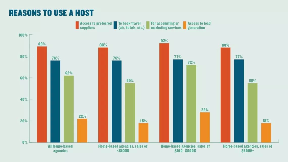 大约每三家在家工作的私营代理商之中就有两家使用主代理,这个数字在低收入代理商之中最高,占到72%。在使用主代理的所有在家工作的代理商之中,大约90%是为了获取首选供应商。四分之三的代理商是为了预订旅行。62%的人使用主代理提供会计或营销服务,这一原因占比在年收入10-50万美元的代理商之中尤为突出72%。只有22%的受访者表示选择联盟是为了获取潜在客户,不过这一比例在中等规模的代理商之中依旧要高一些28%。