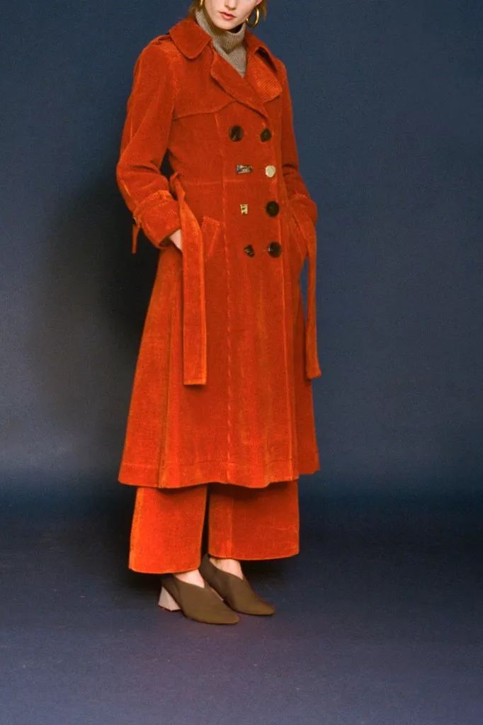 最后,灯芯绒也是今年席卷时尚圈的材质。我觉得最好看的是Rejina Pyo这件橙色的: