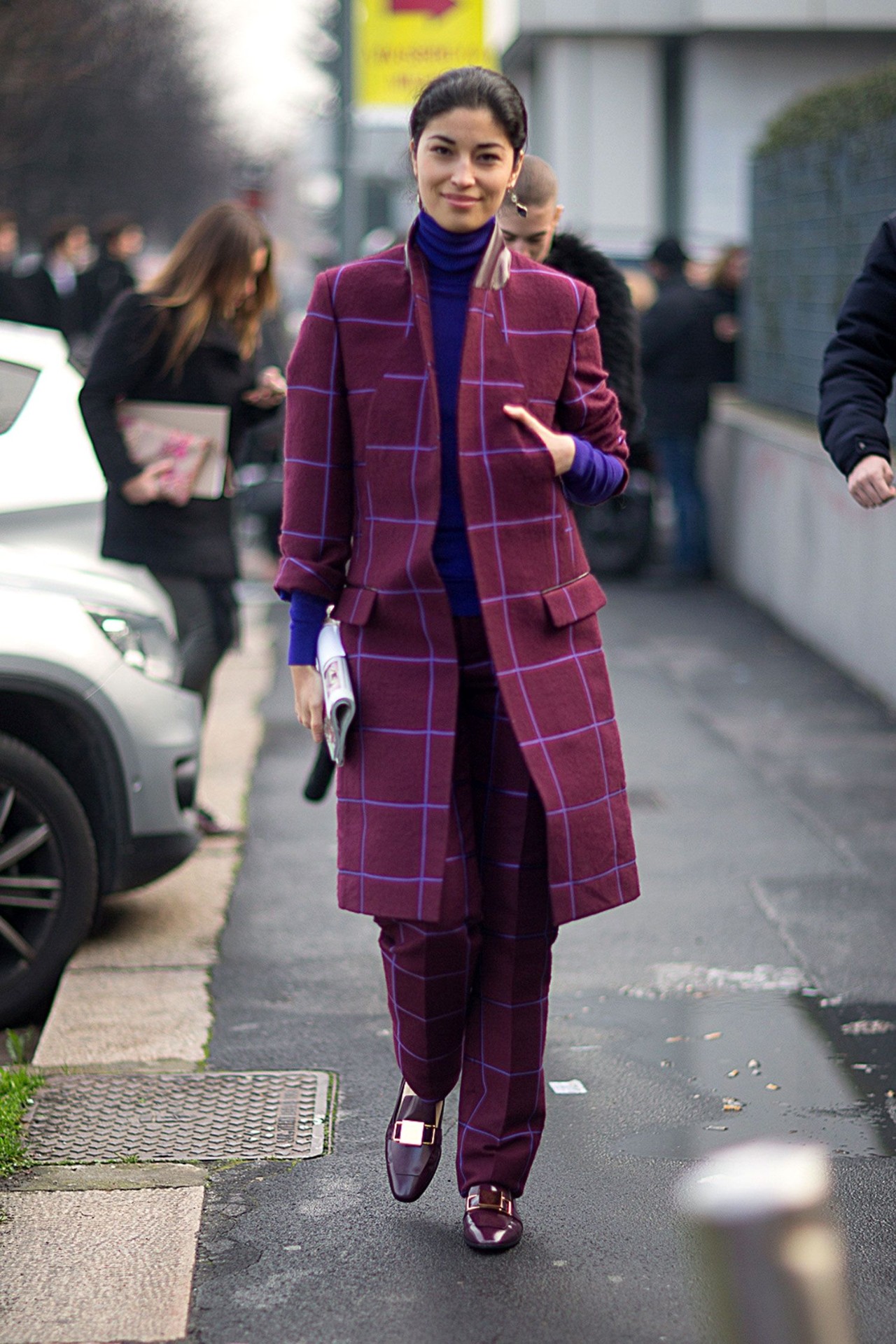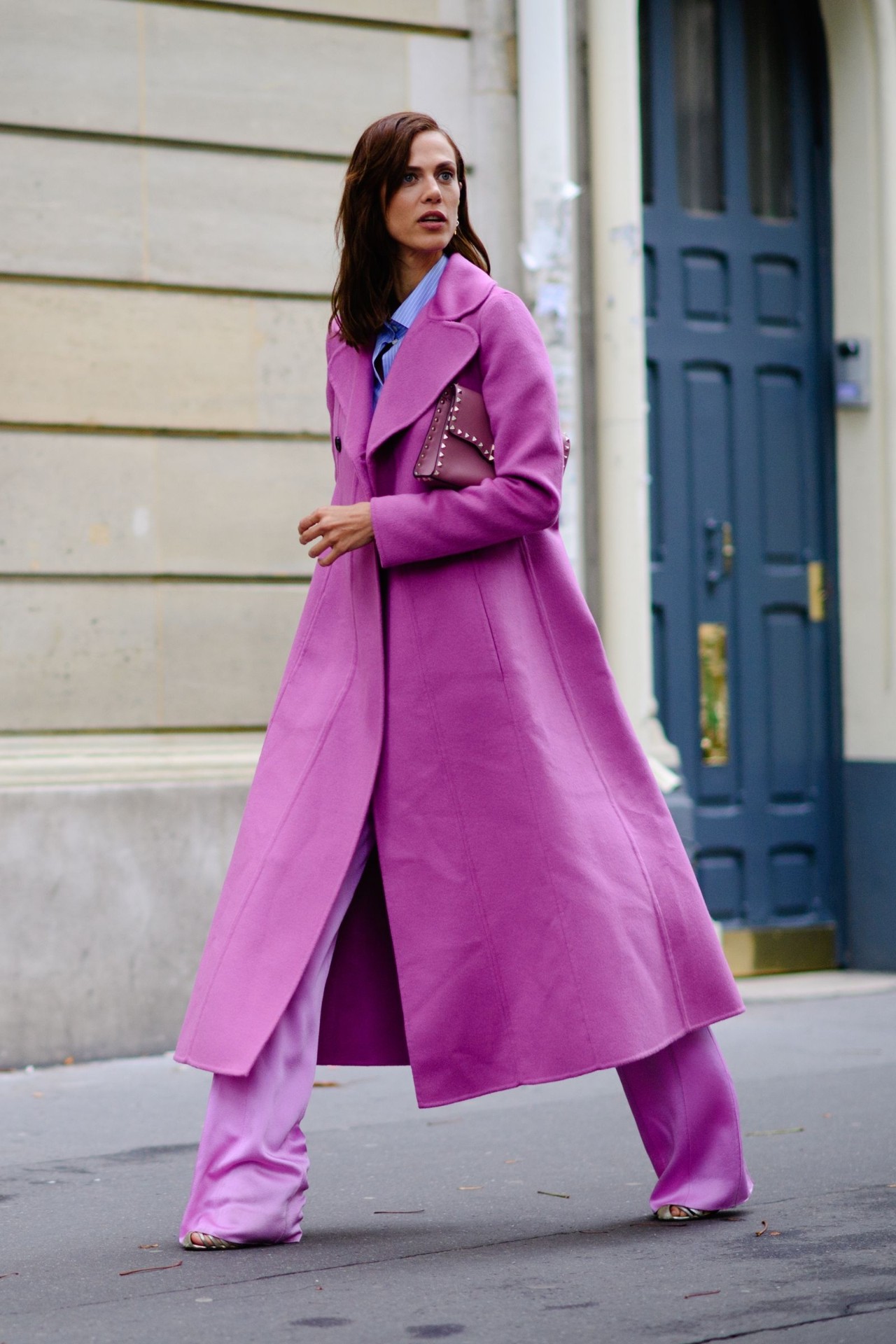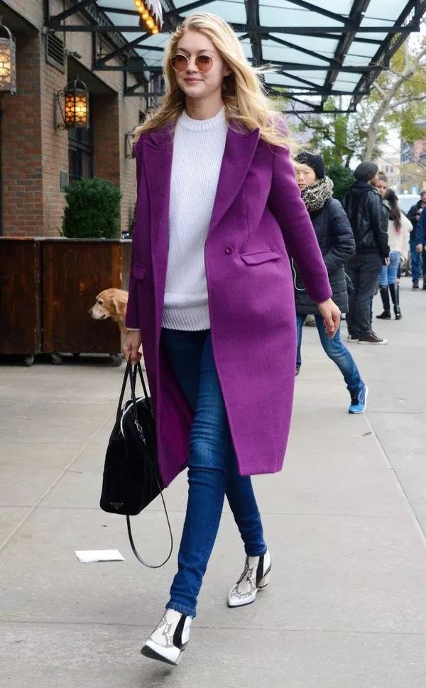 不过,大红大紫真的很挑人。首先,红色如果颜色不正容易沦为老气or艳俗。而品牌level与其成衣的颜色高级与否密切相关。所以虽然到处都能找到红色的大衣,但穿出去不一定高档。其次,红色紫色也很挑肤色挑搭配能力。不信你看,像下图Gigi Hadid 这件紫色的大衣,你觉得好看只因为有她青春无敌的肉体加持,换平常人穿可能立即老十岁。总之,选择要慎重!