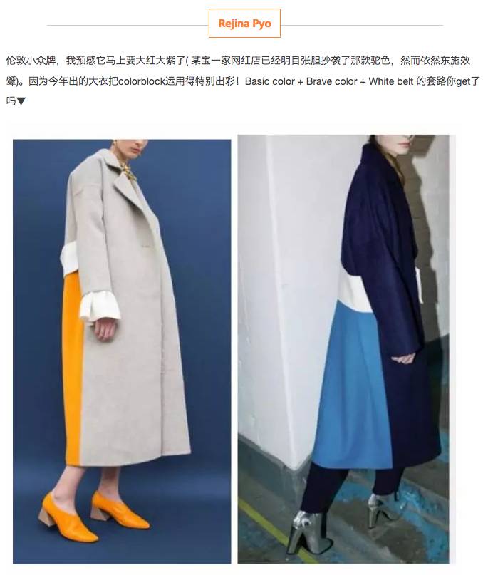 还记得我去年就安利给大家的拼色大衣Rejina Pyo吗?去年也是这个时候(11-14),我写了一篇秋冬大衣推送,最先提到了这个牌子。今年11月才见很多时尚大V在写(反应这么慢都能当大V,只怪自己不红...)