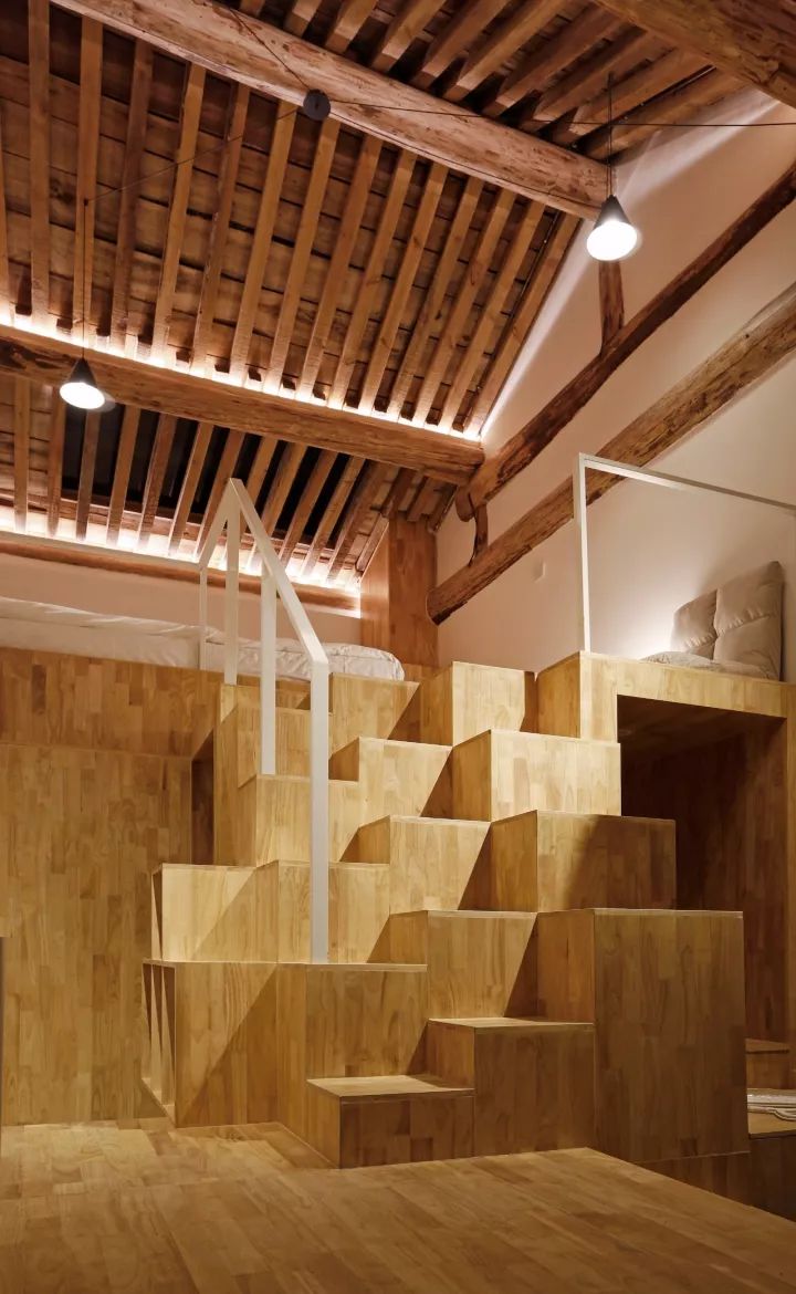 爬上床时要踩过一个个木桩,而不是常规的楼梯。