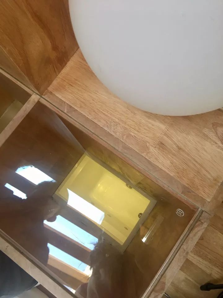 到了阁楼,床对面位置俯瞰下去正对浴缸——设计师索性铺了一块透明玻璃,雾气蒸腾时看得到底下的出水芙蓉。