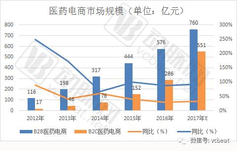在成长性上,B2B医药电商近五年年均复合增速为40%,预计2017年完成交易额760亿元;B2C医药电商近五年年均复合增速超过100%,预计2017年交易额超过500亿元。