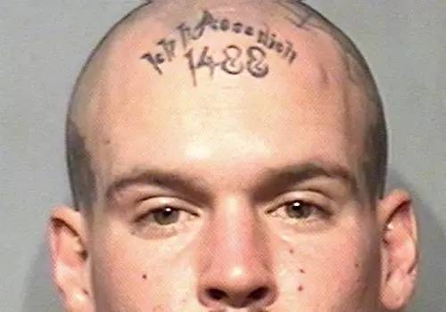 此人因涉毒罪被捕。“上帝与我同在”是曾经俄罗斯帝国和希特勒第三帝国的战斗口号。纹身包含有“侵掠如火、誓死不从”之意。额头上荆棘条有“永不悔改”之意。