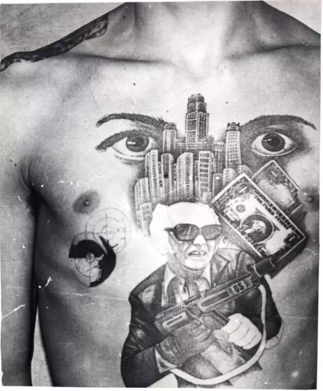 曼哈顿的高楼大厦、美钞、刻着US字样的机关枪,表明这名罪犯向往美国黑手党式的生活。胸口的一双眼睛则是对狱中的其他人表示“我在盯着你呢”。