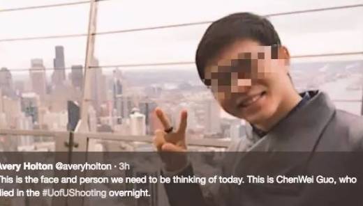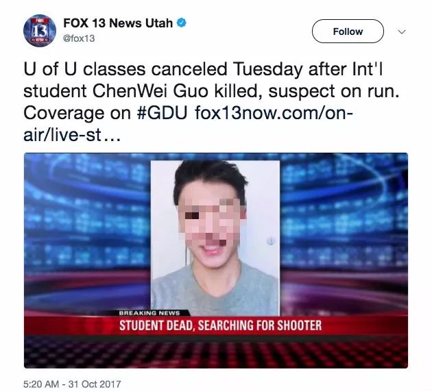 10月30日晚,在犹他大学附近,中国留学生Chenwei Guo被一枪击中头部,当场死亡。