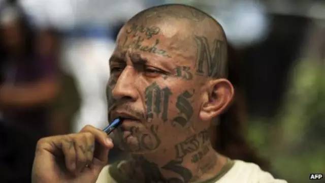 每当你看到有纹身“MS13'或'MS'或'13'的人,这代表的是萨尔瓦多的Mara Salvatrucha黑帮。它可以纹在任何地方,但通常在醒目的区域,比如说自己的脸,脖子,或手上。