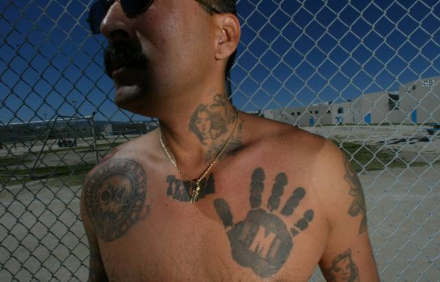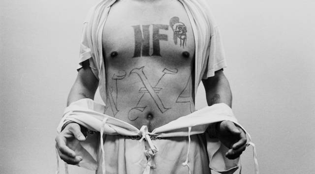 这就是上面提到的墨西哥黑手党的死对头Nuestra Familia。帮派纹身为字母缩写N和F。收入来源主要是走私贩卖可卡因,海洛因,冰毒等。