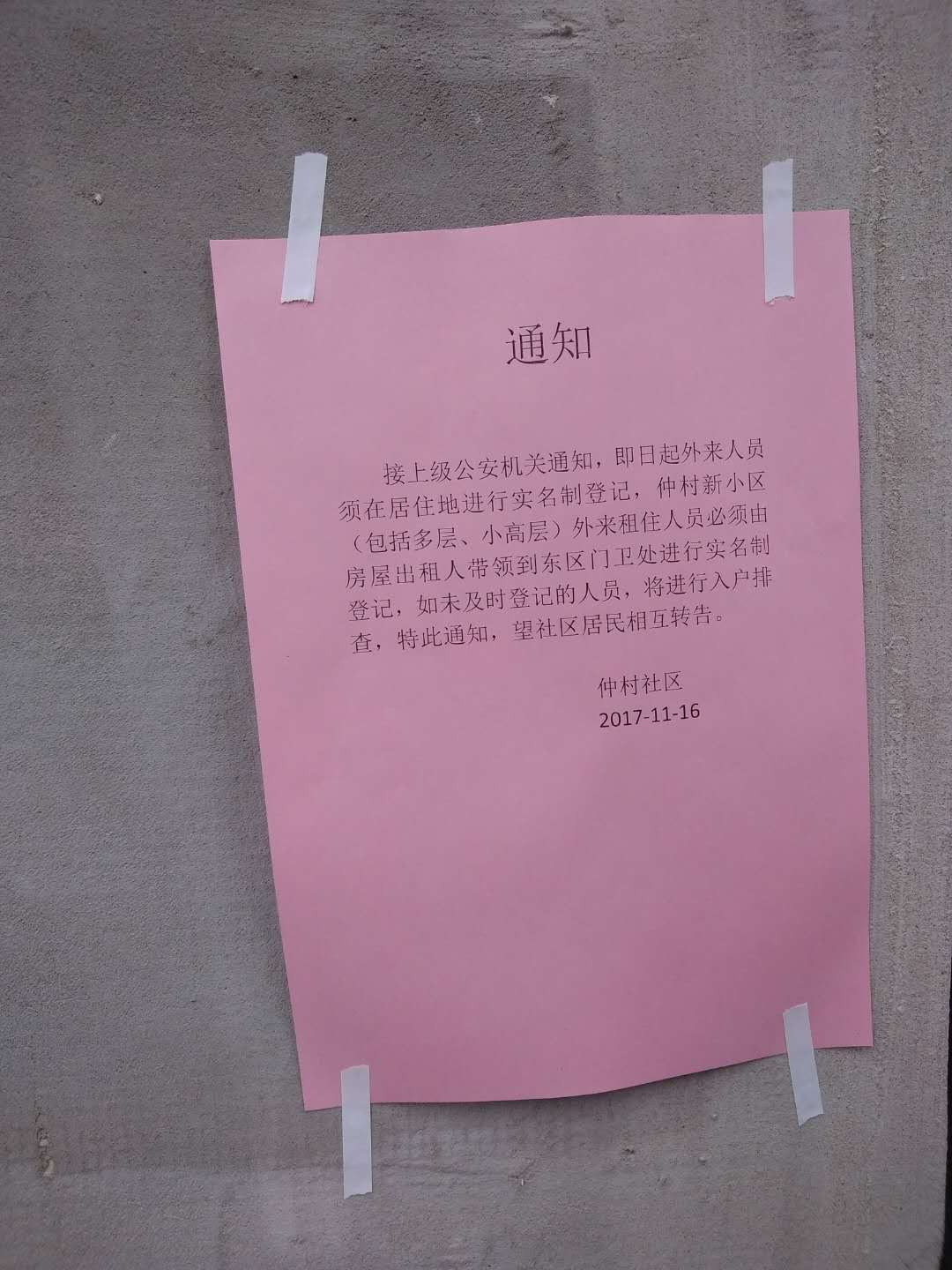 界面新闻注意到,案发后,该小区门口的大屏幕上和每个单元门前都张贴了一则通知。通知写道:“接上级公安机关通知,即日起外来人员须在居住地进行实名制登记,仲村新小区外来租住人员必须由房屋出租人带领到东区门卫处进行实名制登记,如未及时登记的人员,将进行入户排查,特此通知,望社区居民相互转告。”落款时间为2017年11月16日。