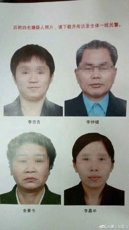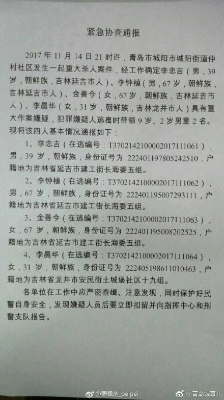 11月15日,据青岛城阳警方通报,城阳区发生一起命案,仲村某小区一家四口被杀害。警方经过缜密侦查、连续奋战,于16日18时许,在北京昌平警方配合下,将4名犯罪嫌疑人(李某吉、李某植、金某今、李某华)全部抓获。