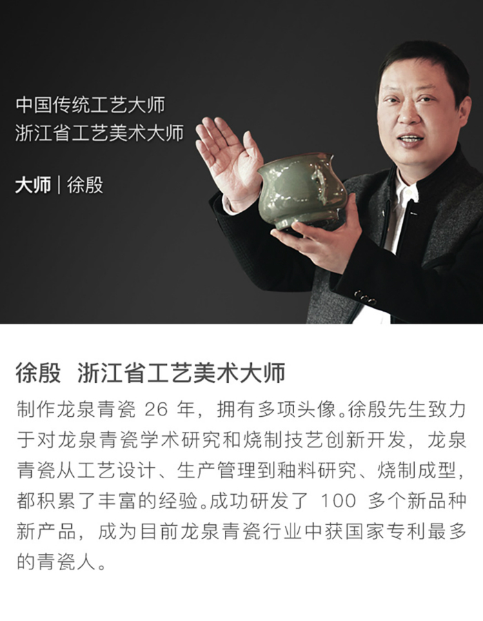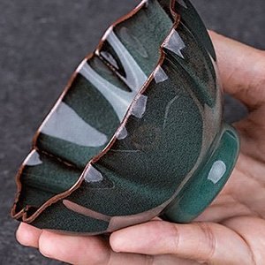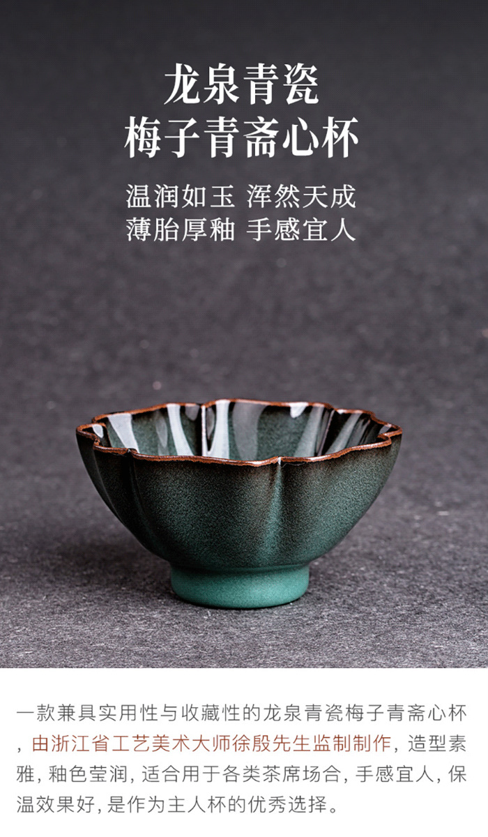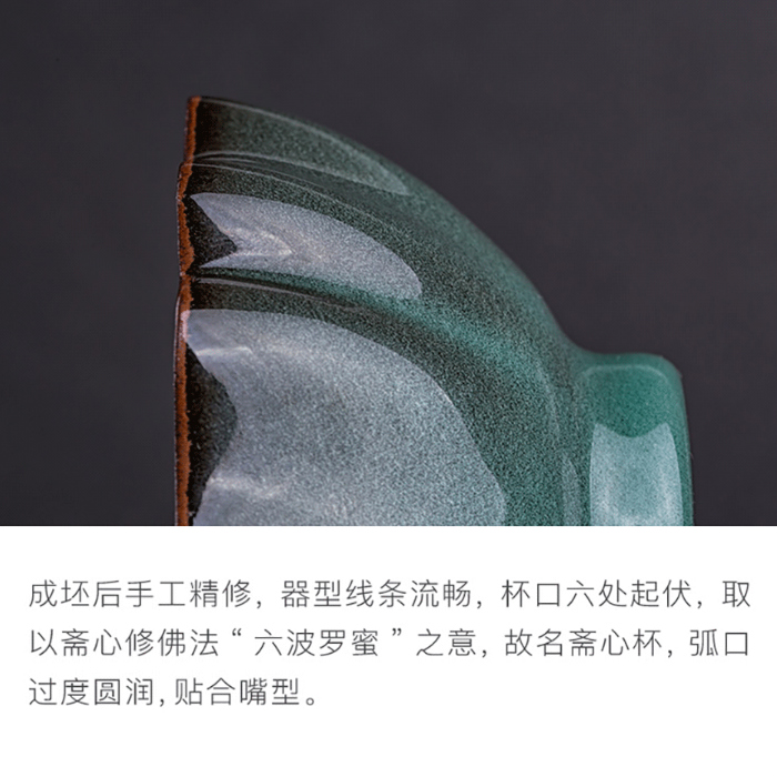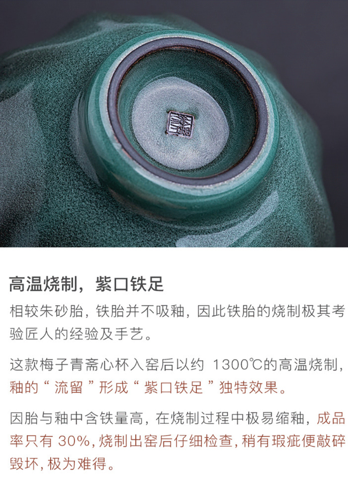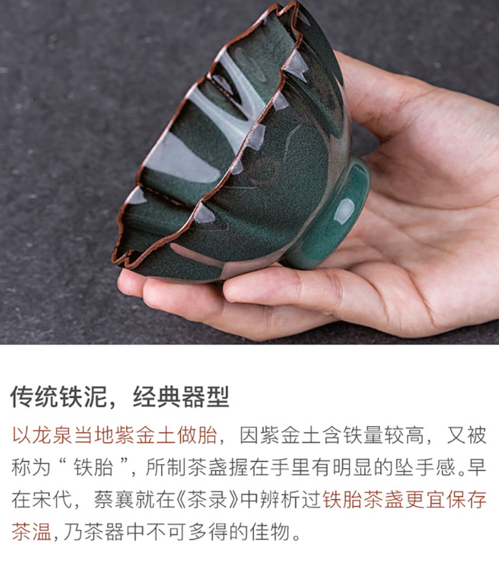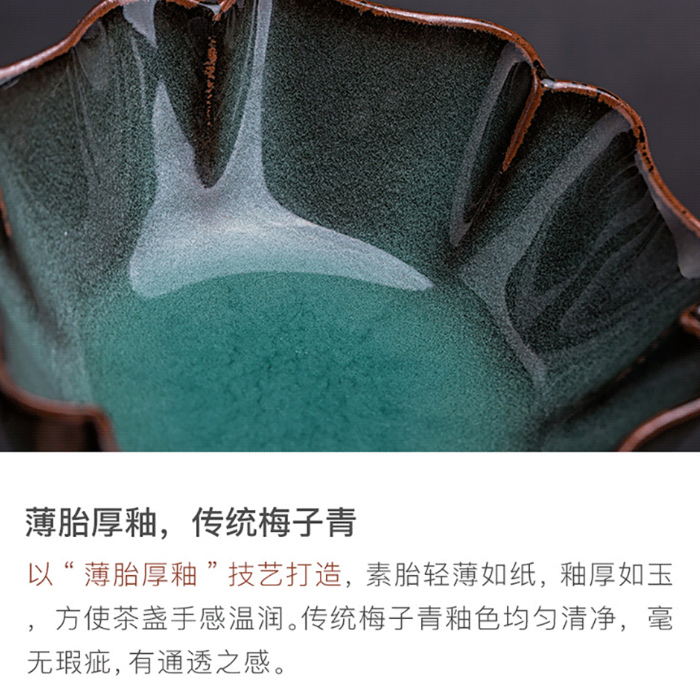 “紫口铁足”搭配梅子青釉色,整杯显得沉稳素雅。杯口流釉稍薄,与铁胎相衬形成渐变的色彩,茶汤入盏,尽显莹润透亮。