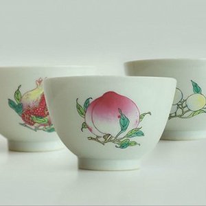 杯身绘制石榴、蟠桃、枇杷图案,传统文化寓意为“三多”: