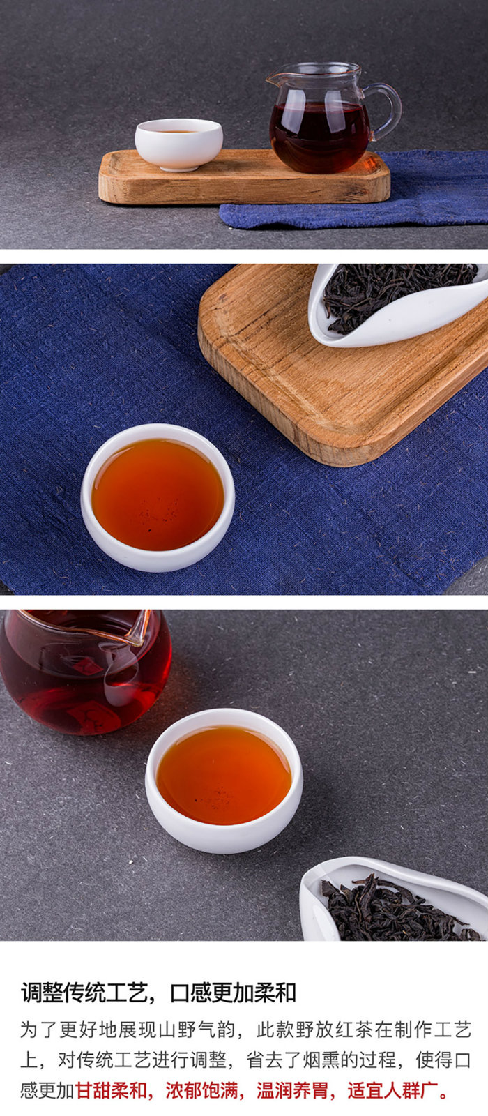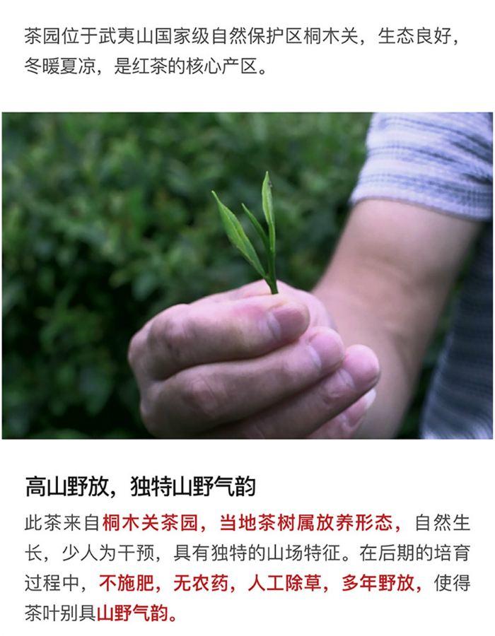来自武夷山红茶核心产区桐木关生态茶园,对传统工艺进行调整,茶汤更加甘甜柔和,浓郁饱满,别具山野气韵。
