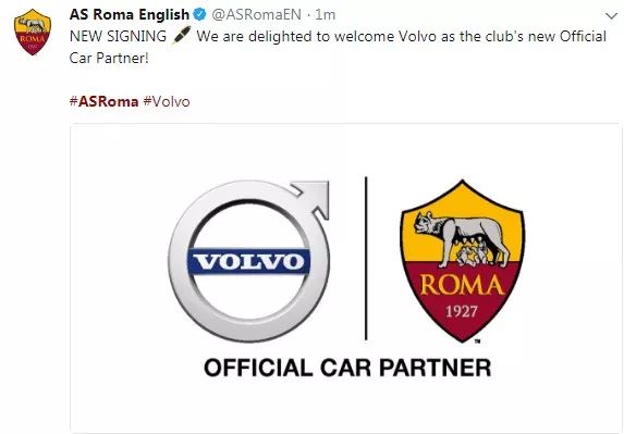11月18日消息,瑞典汽车公司沃尔沃与意大利顶级球队罗马达成一个为期三年的合同,成为球队的官方汽车合作伙伴,沃尔沃将为罗马球队提供车辆服务,并协助俱乐部货物运输。同一天内,罗马宣布签下官方啤酒Peroni 3.5,Peroni作为意大利的百年啤酒坊创始于1846年,由Francesco Peroni创立。