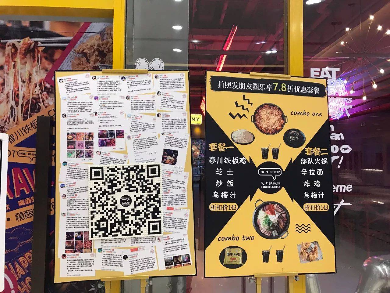 “挂评论”:主打芝士铁板鸡的韩餐店 HAN JIMMY把大众点评的网友评论挂在了进门处,它选择了站肩膀的目标对象是消费者。然而这种方式看多了会给人一种平淡无奇的感觉,比起全是五颗星的评论回复,一二三四五颗星混合的趣味感食客们大概觉得更真实。